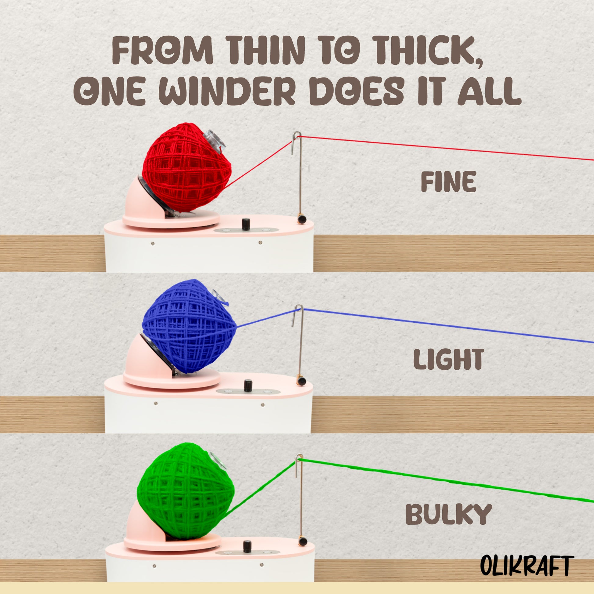Say goodbye to messy skeins and tangled threads. The Olikraft Electric Yarn Winder is designed by crafters, for crafters â giving you perfectly wound yarn cakes every time with ease, speed, and style.